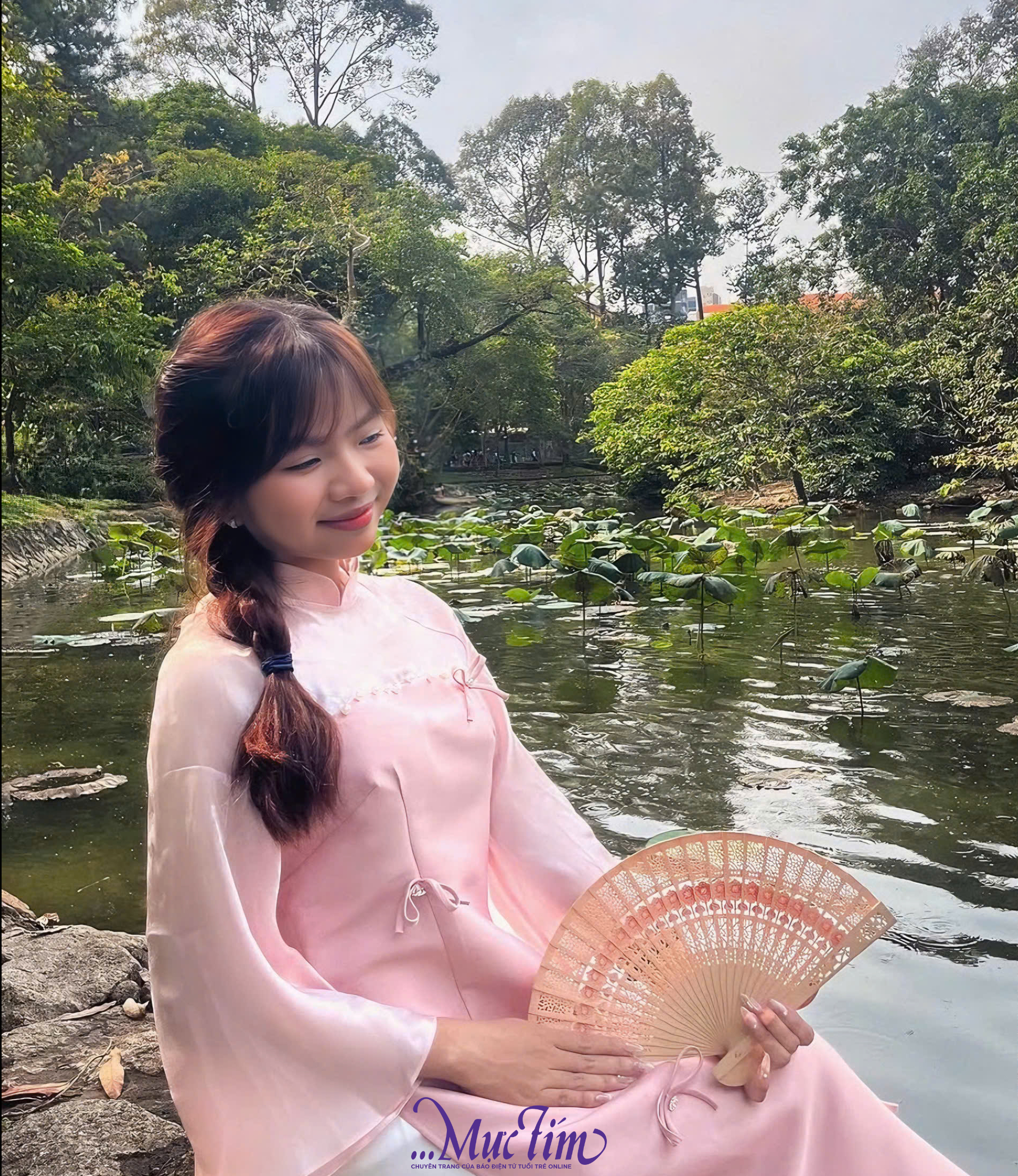 Bạn Yến Nhi (TP.HCM) diện áo dài chụp ảnh tại khu vực hồ sen của Thảo cầm viên - Ảnh: TUYẾT NHI