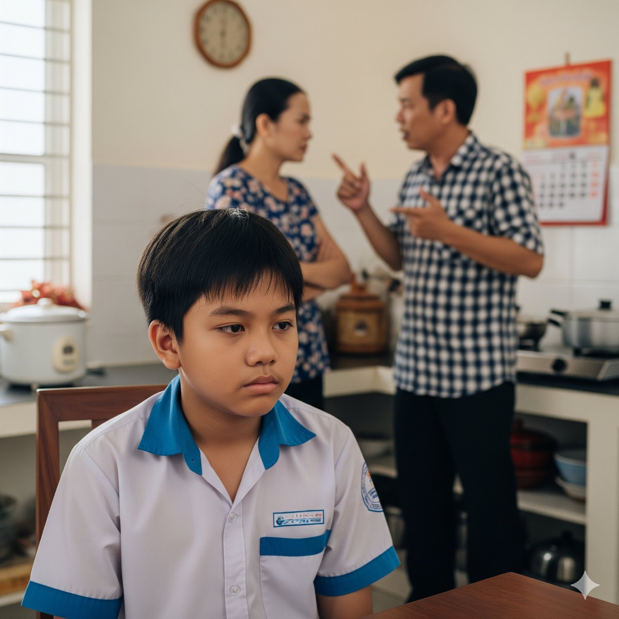 Bạn vội bật nhạc lớn hơn, nhưng vẫn nghe rõ những tiếng la hét, tiếng đập bàn, rồi cả tiếng chén bát vỡ. Bụng bạn quặn lại, và bạn chỉ biết nghĩ thầm: "Lại nữa rồi…". Em trai chạy vào phòng, mắt đỏ hoe và khuôn mặt đầy sợ hãi. Bạn ôm lấy em cho đến khi mọi thứ dần lắng xuống.
